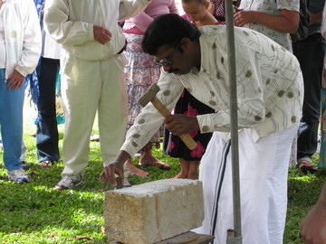Silpi Manikandan explains using the various types of chisels on the granite stone in the weekly demonstrations.