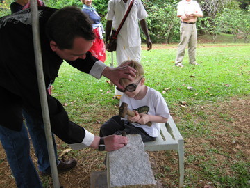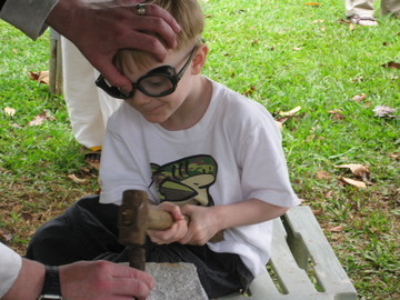 A young guests enthusiastically tries his hand at stone carving with a little help from his father.