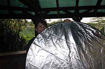 The light behind the subject is way too bright. His face is dark, so we try this reflector to get more light back into the face. This is called a bounce.