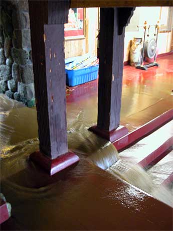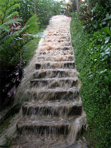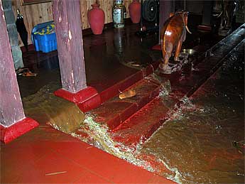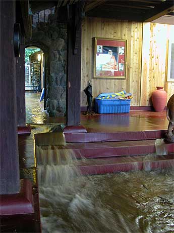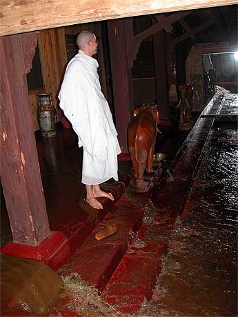 We can't resist but go to fetch Bodhinatha to show him what's happening outside... we have set up a barrier on the left of the walk to prevent more water from flooding the inside of our publications building, meanwhile we are diverting the water down the stairway to the river.