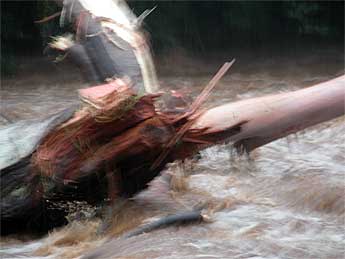 Meanwhile, small trees on the edge of the river are ripped out and on their way to the ocean