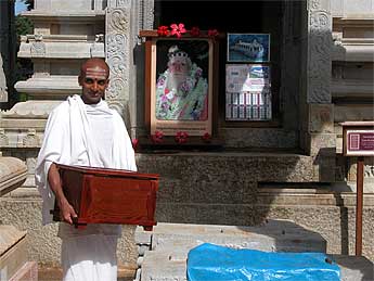Sadhaka Dandapani has brought out the wooden hundi (offering box) to give our tour day guests an opportunity to earn some punyam by donating to the temple.
