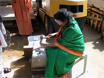 Later the family tried their hand at carving simple Aum symbol and flower designs on a sample stone.