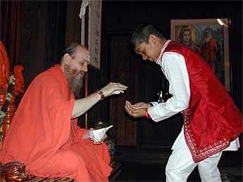 He related how, one day, several years ago, as he was looking at the image of Muniandy, a white face appeared over the murthi, a tall figure with white hair and white beard. It was a conscious vision of an inner being superimposed on the temple Deity. For weeks afterwards he asked people if they knew what it could mean. One day, someone showed him Gurudeva's picture. He was shocked "That's who I saw in the temple vision!" Then, recently when he heard that Bodhinatha was coming and was Gurudeva's successor, he took a break from his temple and drove all the way to meet Bodhinatha and perform the archana.