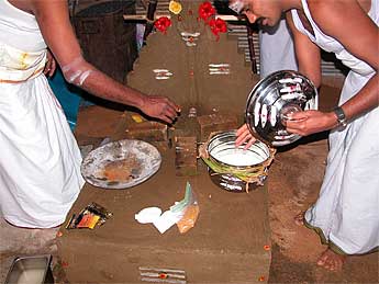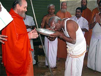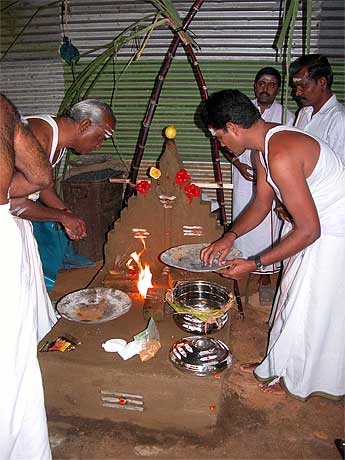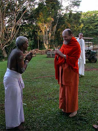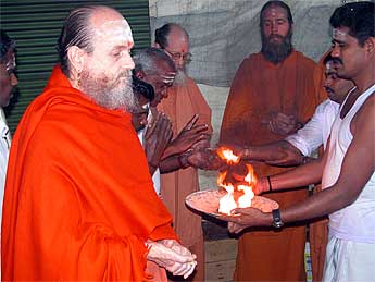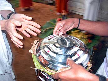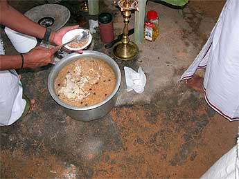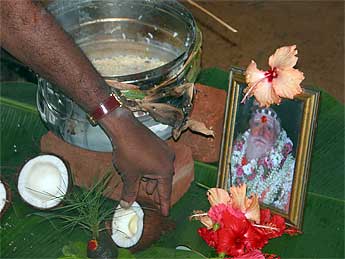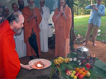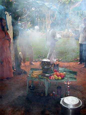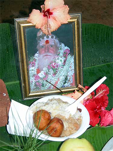 The pongal is placed on the altar next to Gurudeva's photo and a simple puja is performed.