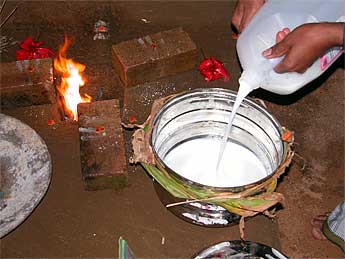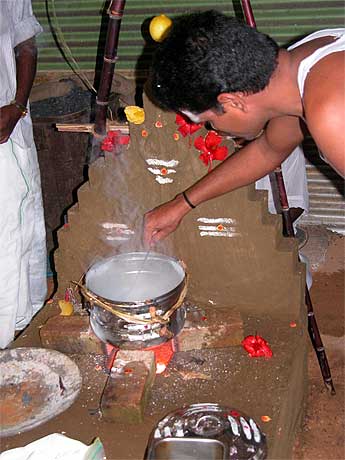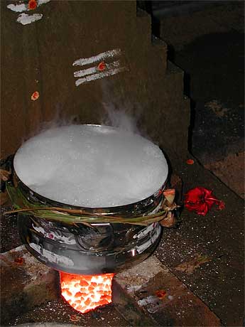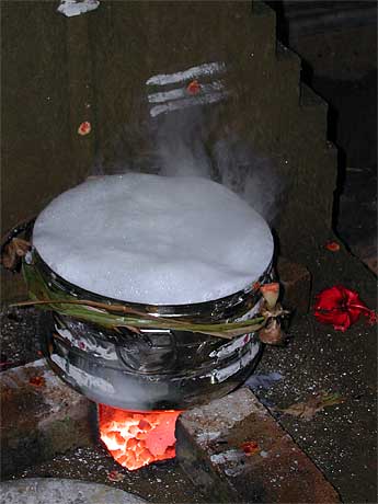 Newly harvested paddy is used. and the pot is boiled to overflowing on all sides, then the pongal is offered to Surya, the Sun, and shared as prasadam to all the devotees.