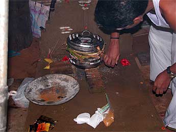 Sambrani incense is raised in a great wave of smoke, offered before the altar and then taken out and offered to the deity of the Sun, Lord Surya.