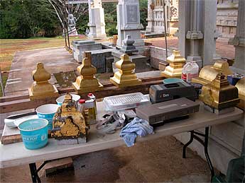 Small kalasam stones, which sit on top of the gopuram are also being gold leafed...