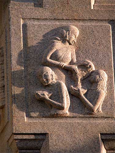 This temple pillar panel piece called "Anna Dana" -- "Food Giving" -- the charitable act of feeding those in need, shining with a yellow hue, tells the story: