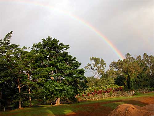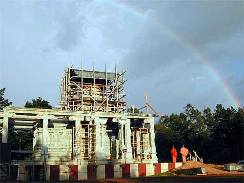 Today was Thai Pongal, and what a beautiful, auspicious morning it was at Iraivan where the whole monastery went to join the silpis for the Pongal ceremony. The sun breaks over the eastern horizon, sparkling through light showers, blessing us with golden light and rainbows.
