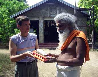 Living Heritage Disaster Relief Director Patrick Harrigan presents Rs. 50,000 (ca. US$500) which he raised among local donors to Rajendra Swamigal of Sundara Velayudha Swami Kovil, Gopalapuram, Trincomalee District for immediate distribution to families affected by the disaster.