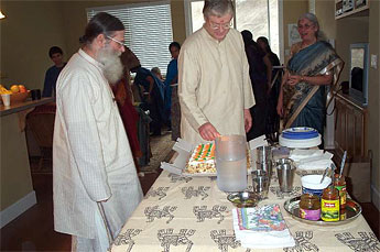 The pada puja starts with Kulapati Vijay Sankara as the priest and Tiru Eesan Sankara assisting.