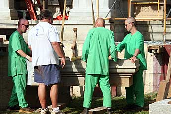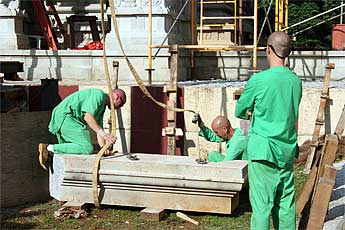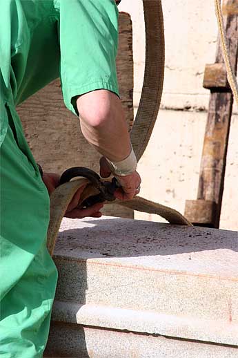 Exacting placement of a stone weighing 3,000 pounds while up in the air like this is a challenge.