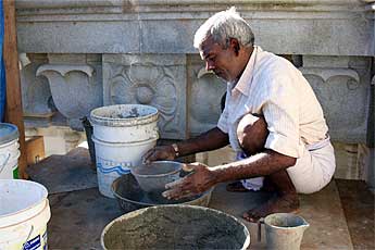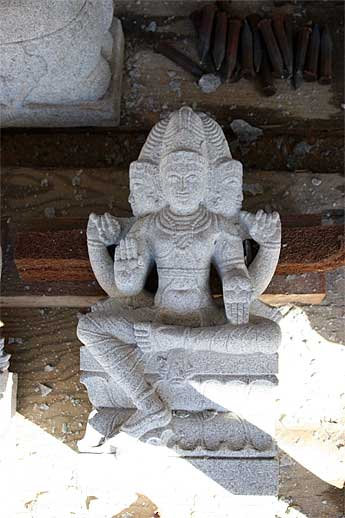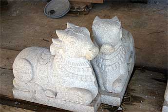 Small stones destined to finish off the main vimana have arrived in the recent shipment. These pairs of Nandis will be one on each corner...