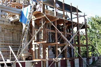 The past week our Siddhidata Team and a few of the other monks helping in the afternoon have been working really hard to erect a super scaffolding structure around the east Chinna Gopuram.