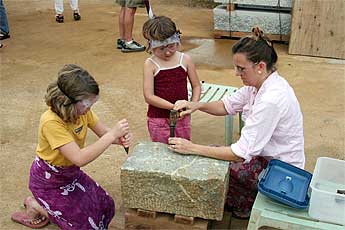 Two little girls try their best to chip away a piece of granite with their mother's help.