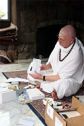 Sadhaka Haranandinatha in the temple working on a mailing to our San Marga devotees and donors.