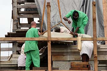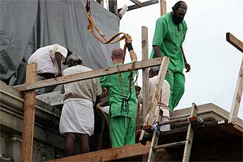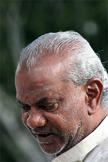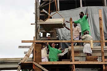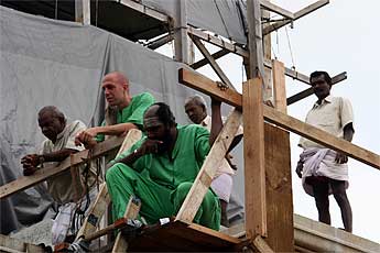 The giant scaffolding project done last phase proves successful as the aerial team of five is working up high around the top of the gopuram... safe and stable.