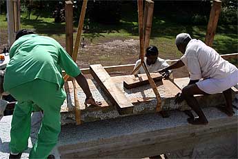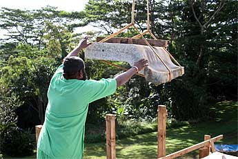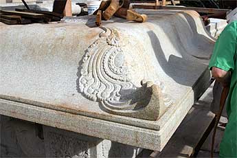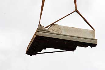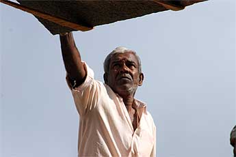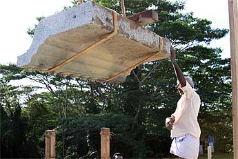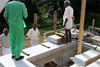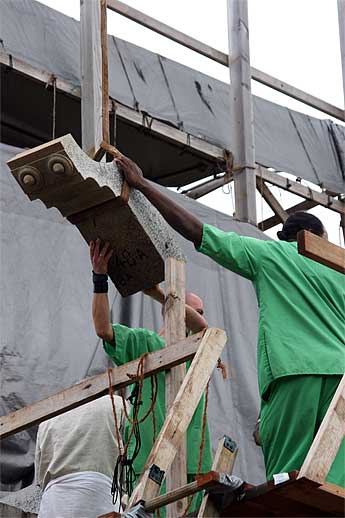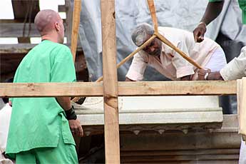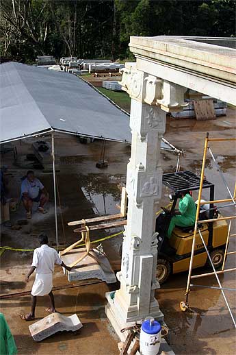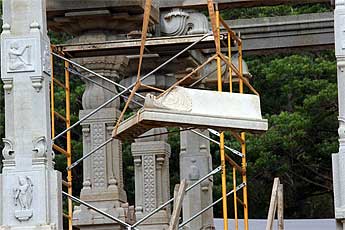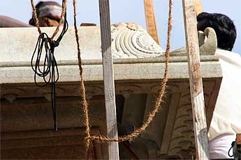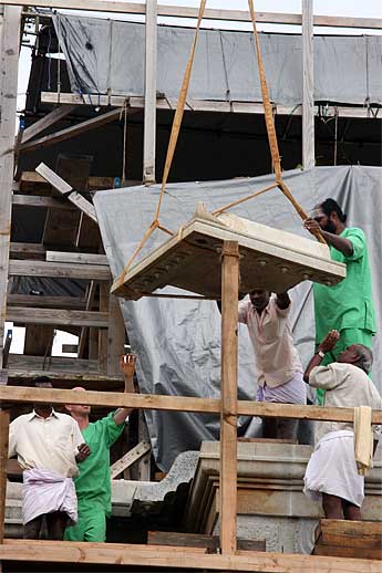 Sthapati, Sadhaka Nilakantha, Yoginathaswami, Sankaran and Karuppiah are topside, waiting while the ground team rigs the next stone.