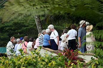 Later in the morning a busload of elderly came on a tour with Larry Rivera, local musician and friend of the monks, who always comes here to sing the Waialeale Song on the look out over the river with the mountain in the distance.