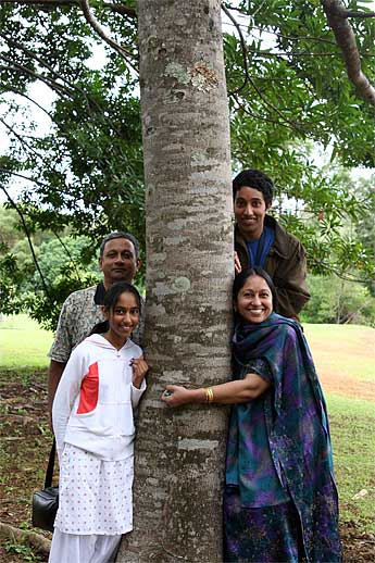they are with their children Anand and Priyanka hugging a rudraksha tree.