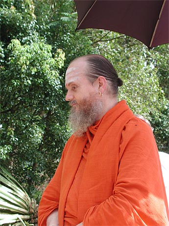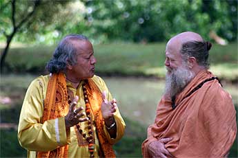 An interesting guest from California, Yogi Ramesh who teaches yoga in Hollywood. He describes his "Yoga of the Heart" to Sivakatirswami. He's a married man spreading the yoga teachings in an unusual area of America.
