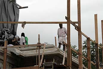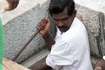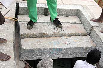 mmm. well, we thought it would fit, but it seems we have a two inch excess on this piece! what to do? bring in the skilled Sankaran who has to knock away the edge in short order.
