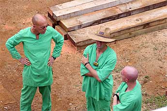 Our ground team takes a moment while the crew above places the stone.