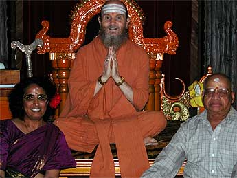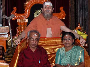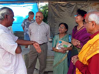 Today was the last day of a long six-day phase and full of guests. A huge crowd of tourists were here for the regular phasely tour and two devout Hindu pilgrim families to attend puja. It is Konanur and Arundati's 48th wedding anniversary today. Here they are receiving a shawl blessing from Bodhinatha. Congratulations to both of you!