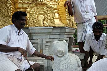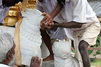 Brahmachari Vel Mahalingum washing the Muruga murthi.