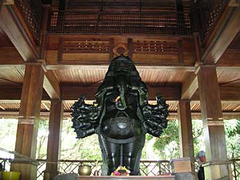 "Lord Pancha Mukha Ganapati stands majestically amidst the wooden structure of the Ganesha Mandapam at the Spiritual Park. On a normal day the place is quiet and soothing for the devotee in search of peace of mind."