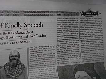 The Vanakkam newspaper publishes every month a talk of Satguru Bodhinatha Veylanswami. This month the Talk was entitled "The Power of kindly Speech". Bodhinatha says: " Words can hurt others, so it is always good to avoid harsh language, back biting and even teasing", and quoting Gurudeva:" Think before you speak, and speak only that which is true, kind, helpful and necessary."