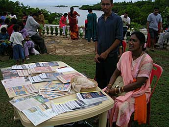 Such tables are also of good use to display Hinduism Today newspapers and to sell subscriptions. Here Kulamata Saranamutha Pareatumbee is doing this seva.