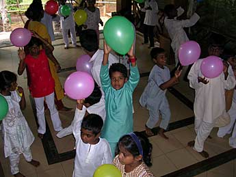 Children of the Saivite Hindu Religion classes at the Spiritual park playing a concentration game with colorful balloons.