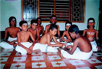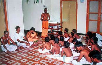 An elder in the village addresses the boys after their morning prayers and puja. They are being strictly guided in ways to deal with such a difficult time in their life, and Gurudeva's teachings of "I'm all right, right now" are a practice for each of them.