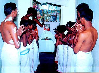 Worshipping together in the early hours of the day. Looking closely, you can see Gurudeva's photo on the altar and his holy sandals below.