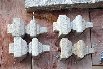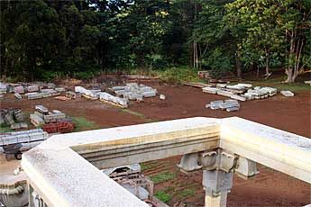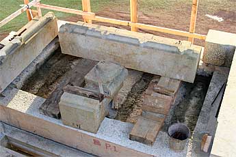 Looking southward... roof beams span the bhadra pillars with stones arrayed in the background