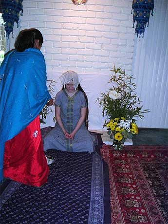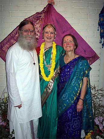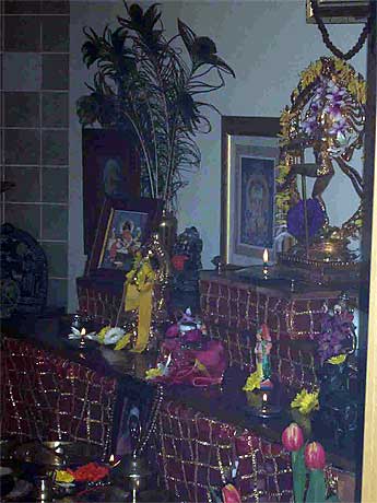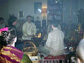 After Satsang final preparations were made for the ritukala (coming of age) samskara for Yatrika Ajaya. All of the ladies joined in arranging flowers, setting up the area in front of the hearth for Yatrika to stand, preparing the trays. The men readily joined in as they were called upon to help.