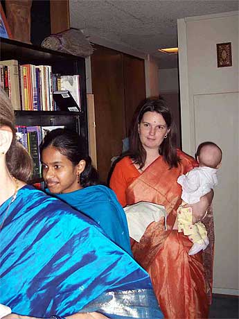 Procession of trays into shrine room. Grihini Sahana Param carries tray with one hand and in her other arm, Bela Sundari.