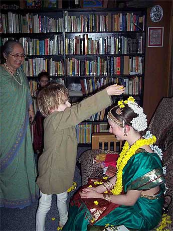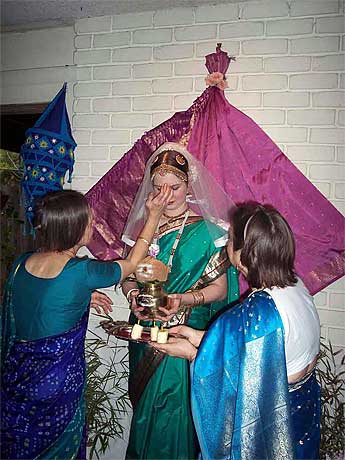 Her mother, Amma Punita, puts kumkum on Yatrika's forehead.