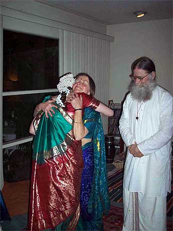 After prostrating to Appa and Amma, Yatrika and Amma enjoy a loving hug.