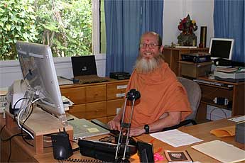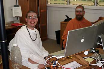 Today, we visit our ever-productive and ever-efficient Pillaiyar Kulam. Here is the talaivar, artisan in charge, Sannyasin Shanmuganathaswami. For the last several days he has been working to prepare our 2005-2006 panchangam (astrological almanach), especially revising the program that generates it to give more refined calculations of the "yogas" (combinations of week-days with lunar asterisms). The panchang will be posted soon at www.himalayanacademy.com.
