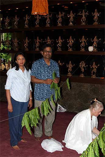 Narayandas and Sangeetha Kamath are here on pilgrimage from Toronto, Canada for 7 days. Here they are helping with Mahasivaratri decorations. Narayan promised Bodhinatha last year when he met him in Toronto that he would visit soon. So, they came for Mahasivaratri to fulfill that promise.