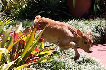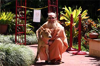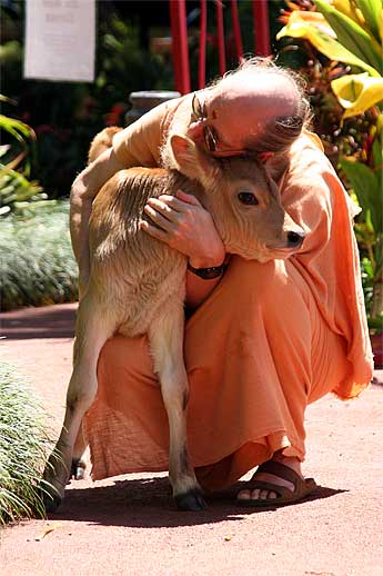 Shanmuganathswami and Sadhaka Jivanandanatha are raising and caring for the calf. He brought "Anu" out to play and get some fresh air and sunshine.