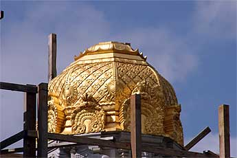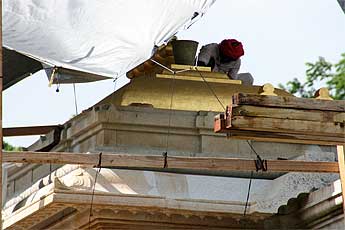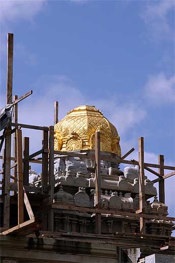 Work continues on the top of the East Gopuram, still "under wraps" to protect the team from sun and showers.
