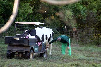 A small series... from early this morning, Sadhaka Jivananandanatha drives out to check on one of our giant Holstein's who is about to give birth, that's "Hana"