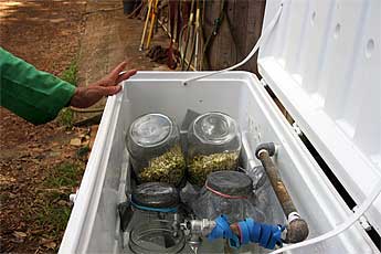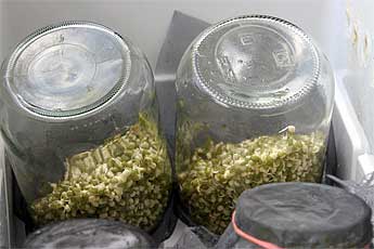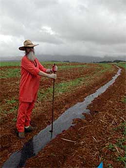 OK, your TAKA caption writer got initiated into the new camera this morning and went to take pictures for a Hinduism Today article and took a detour... Here is Sadhaka Adinatha, watering the mung bean sprouts which he does twice a day...