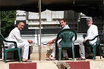 Back at the Ekadanta Kulam where we will drop off the camera to our official photographer, we find him wired to the phone working on event coordination. The July open house is one of his big projects... and planning an event for the expected 700 island guests is a big job.