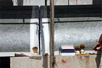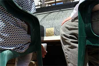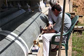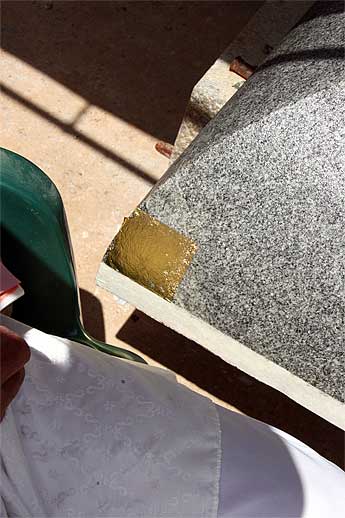 ext Chinna Gopuram is going well and it's time for the gold-leafing again. Deva Rajan, Tandu Sivanathan and Kanda Alahan get started today. Earlier this morning they applied "sizing" (a kind of special sticky varnish) to the stone... and are back to begin....