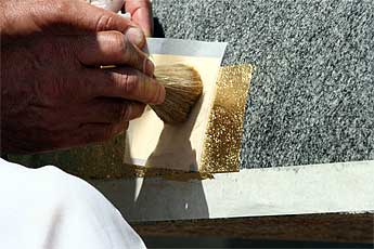 You lay the paper sheet with gold backing on the stone and pull it off... the gold sticks on and then you lightly burnish it down with a brush.